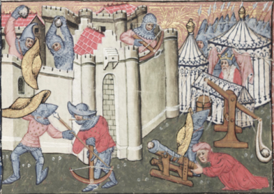 En esta miniatura de un códice del siglo XIV vemos cómo se combina el uso de la bombarda y el trabuco con el ataque de tropas lanzaproyectiles.